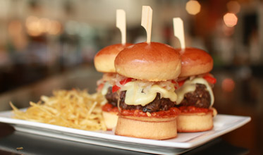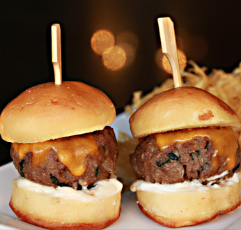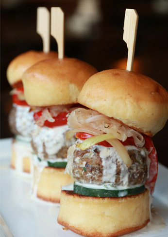 Spiced lamb meatballs on slider buns topped with sliced cucumbers, roasted tomatoes, sautéed onions, pickled veggies and blue cheese sauce.