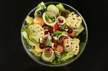 Romaine lettuce, roasted tomatoes and onions topped with crumbled feta cheese and baked mozzarella triangles. Served with creamy blue-cheese vinaigrette and baked-Parmesan crisps.