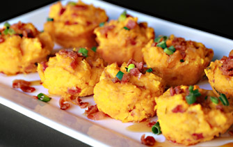 Bite-sized mini-muffins baked with fresh sweet potato and spicy jalapeños, topped with crispy bacon and served over a sweet maple glaze.