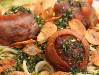 Bacon wrapped chunky shrimp meatballs served over spaghetti and topped with roast-nut pesto and crispy garlic slices. Served with a homemade garlic parmesan knot on the side. 395