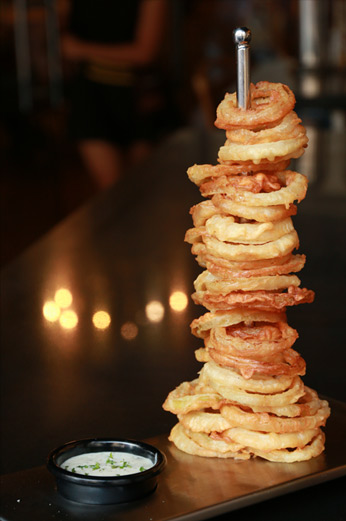 and topped with classic marinara sauce, sautéedonions, gooey mozzarella and crispy onion rings.