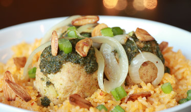 Tofu-mushroom veggieballs served over Java rice with crispy garlic slices, sautéed onions, chopped celery and topped with roast-nut pesto.